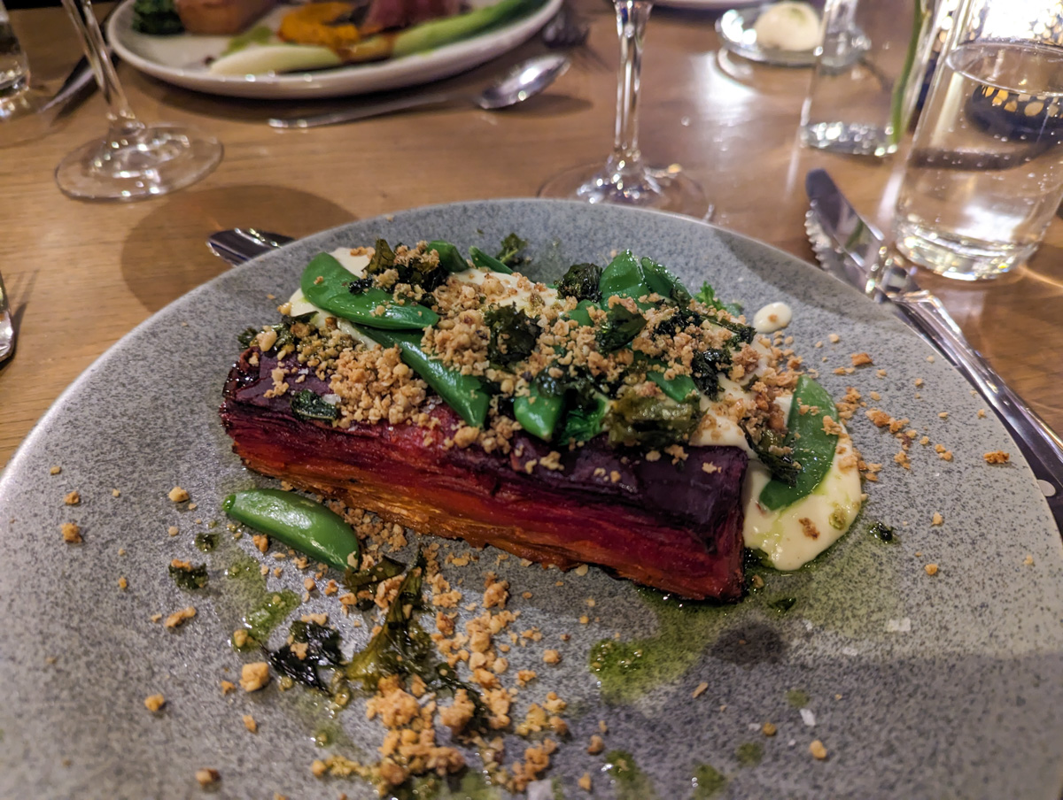 I enjoyed a beetroot salad to begin with, followed by a vegetable terrine and ultimately a rich white chocolate mousse.