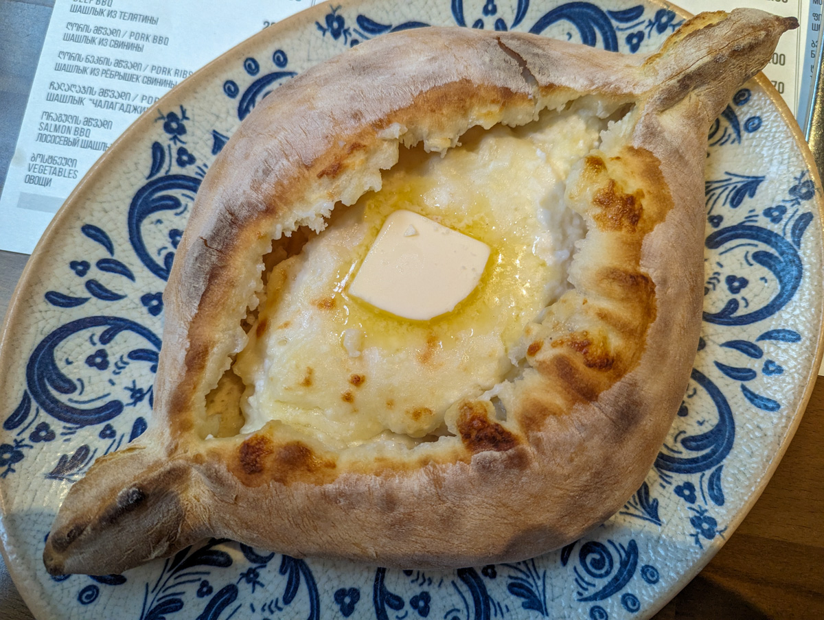 The most famous dish is the Adjaruli kachapuri, a cheesy boat-shaped bread with a cracked egg and a stick of butter in the middle (not one to eat if you’re on a diet!).