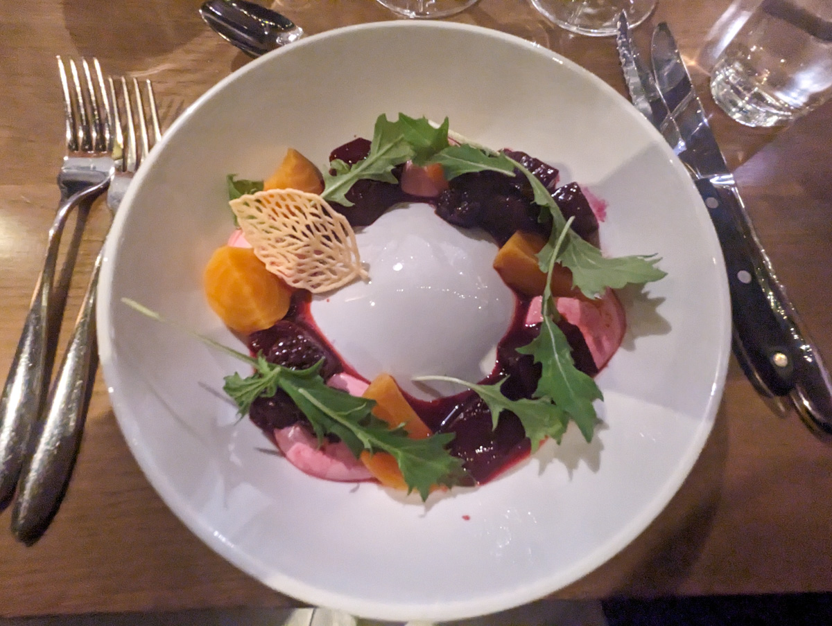 I enjoyed a beetroot salad to begin with, followed by a vegetable terrine and ultimately a rich white chocolate mousse.